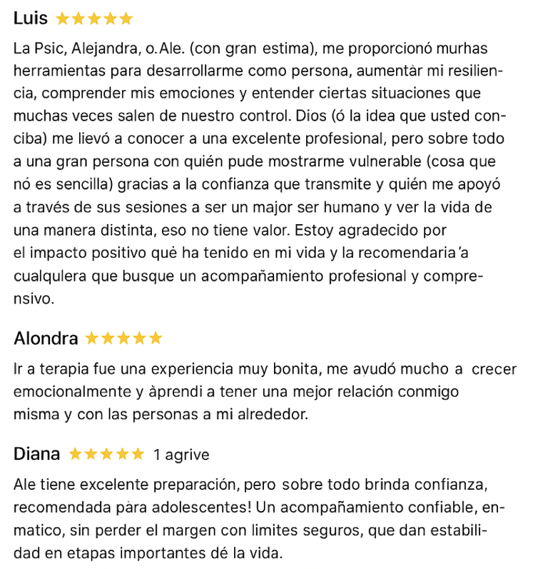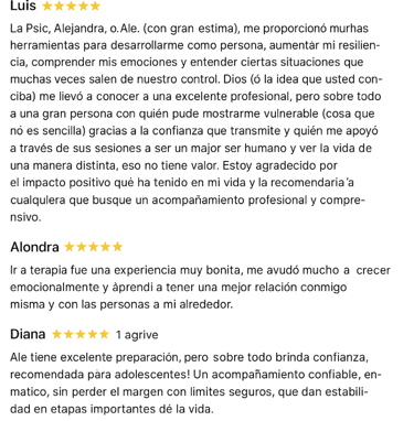 “Ale tiene excelente preparación, brinda confianza y acompañamiento empático, ideal para adolescentes. Sus límites seguros dan estabilidad en etapas importantes.”
